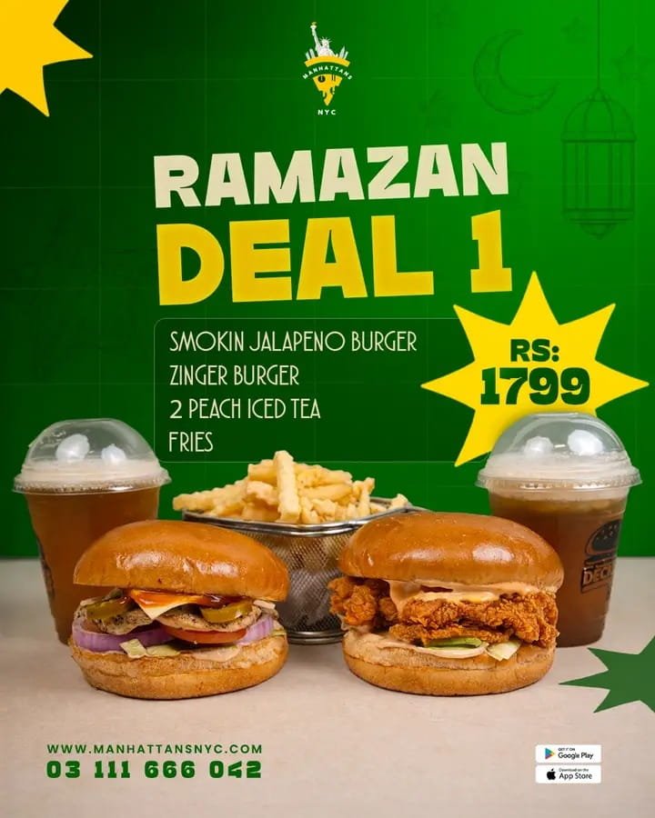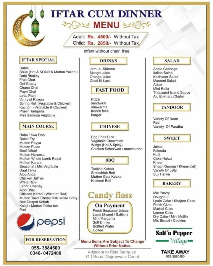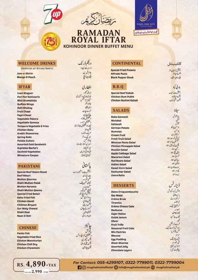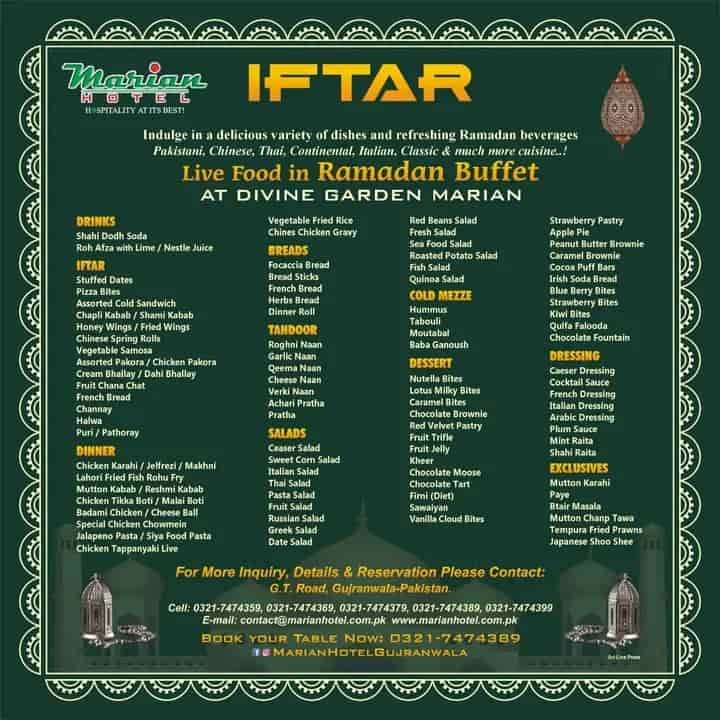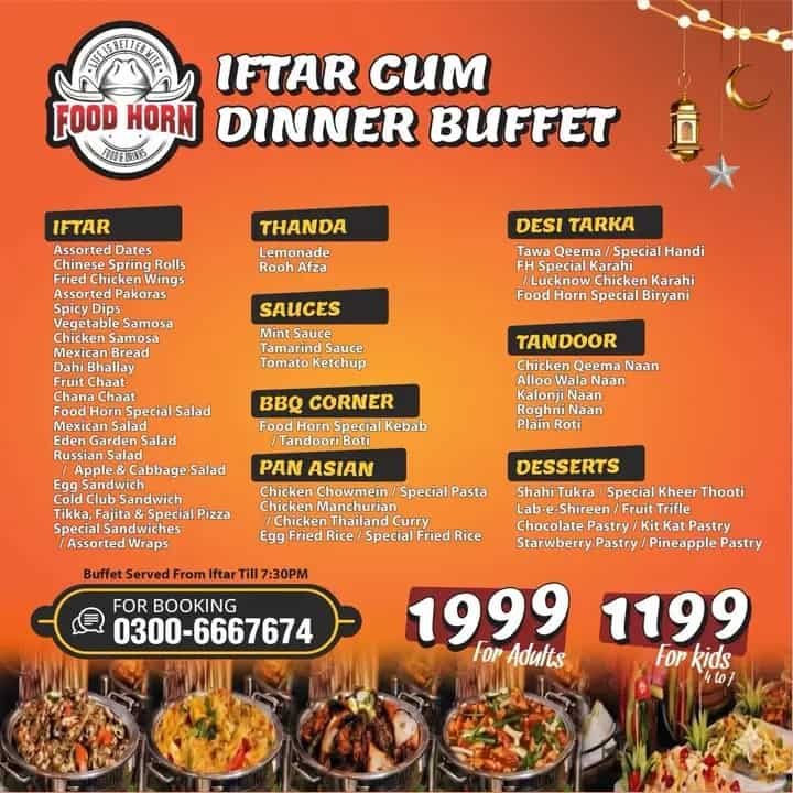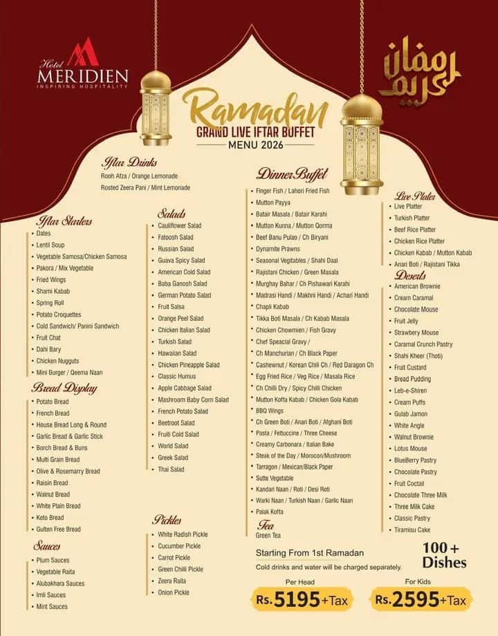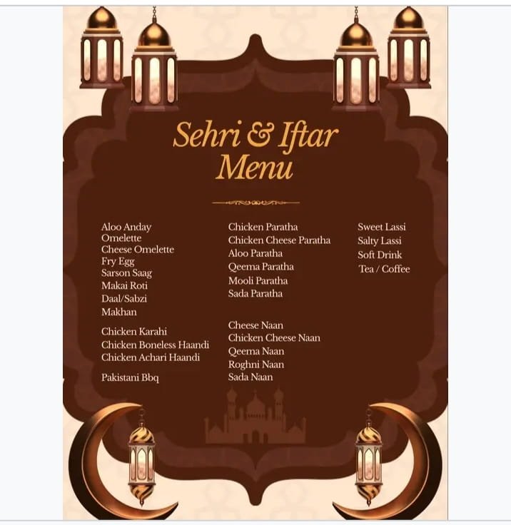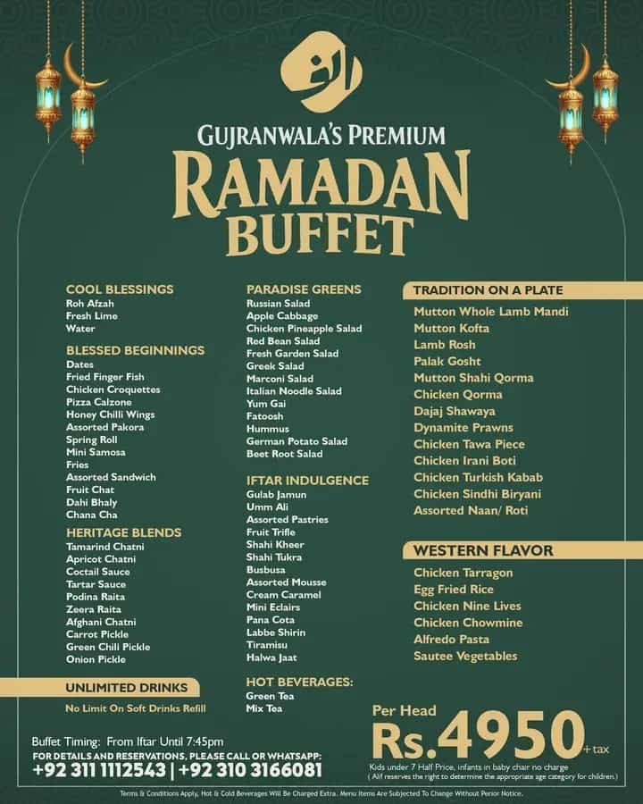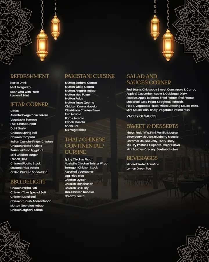 Their iftar menu usually includes BBQ, karahi, salads, and desserts.