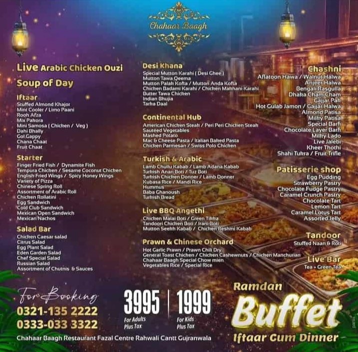 Gujranwala offers an amazing variety of iftar buffets ranging from luxury hotel dining to budget friendly BBQ spots.