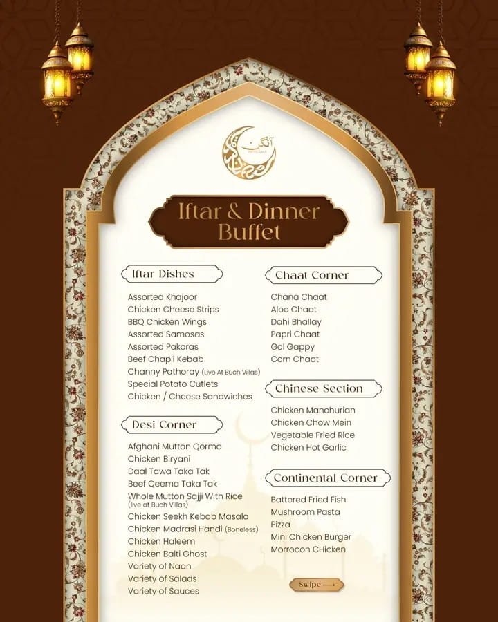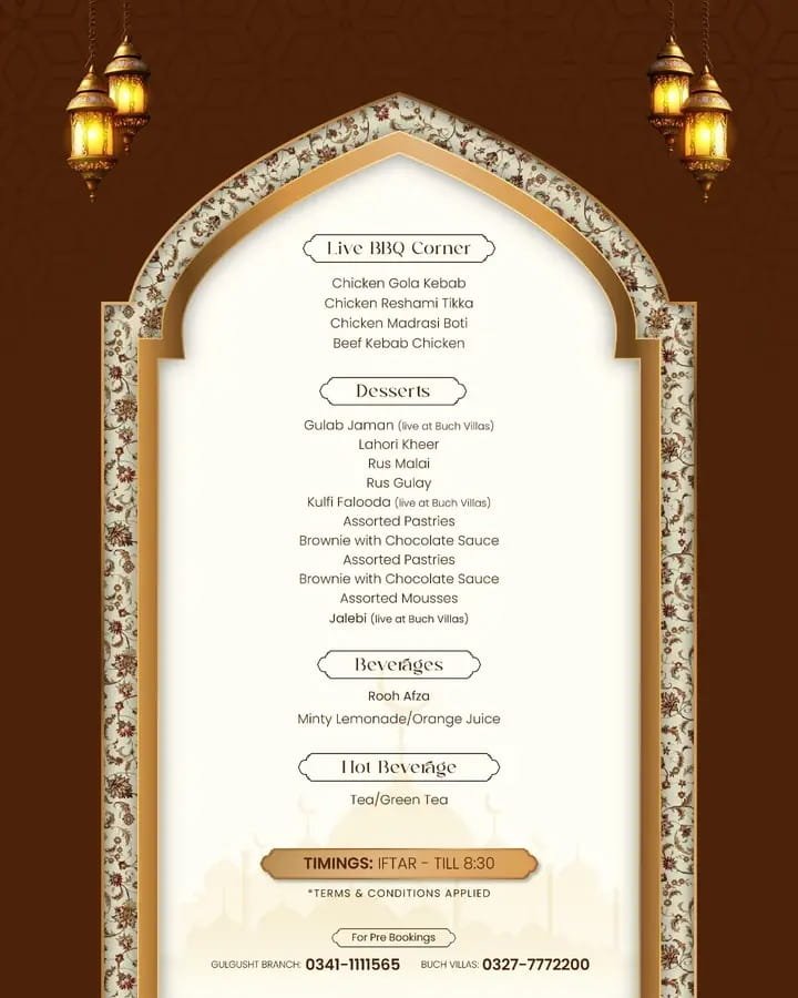 Their iftar buffet usually includes grilled meats, karahi, biryani, chaat, and desserts that satisfy every craving.