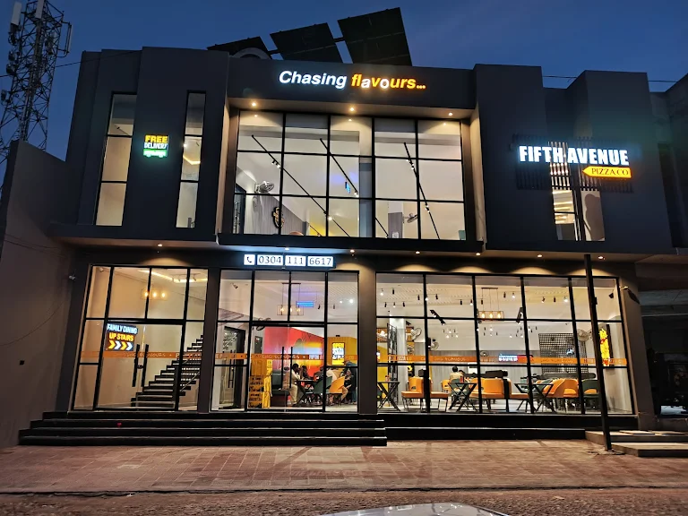 Fifth Avenue Pizza is a modern pizza outlet offering cheesy pizzas, burgers, and fast food items.
