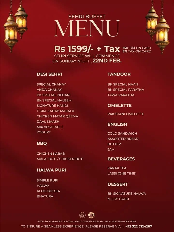 Faisalabad offers a wide range of Sahri buffet options that cater to different tastes and budgets.