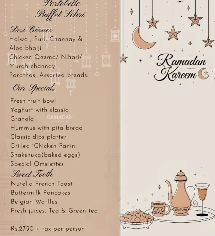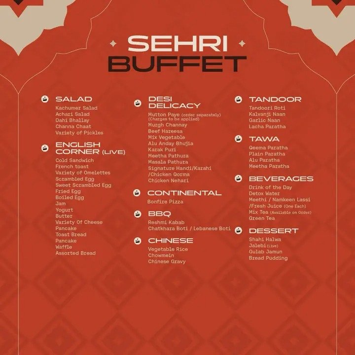 Their Sahri buffet is famous for offering a rich variety of traditional Pakistani dishes along with refreshing drinks and desserts.