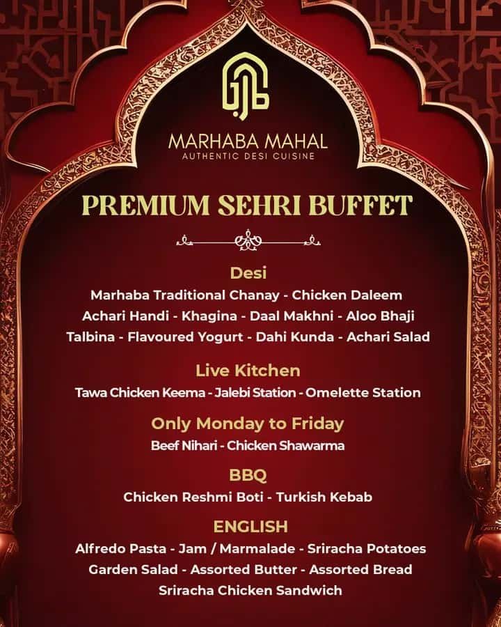 Their Sahri buffet includes freshly prepared BBQ, karahi, daal, rice dishes, and a variety of breads.