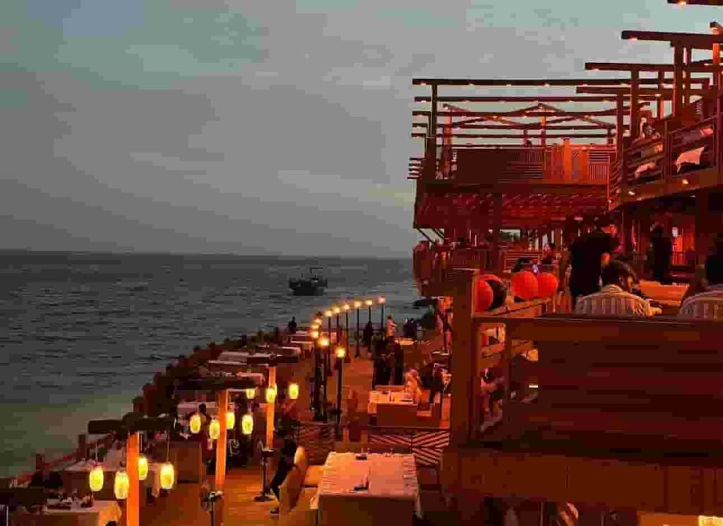 Guests can enjoy BBQ, seafood, karahi, biryani, and desserts while overlooking the sea.